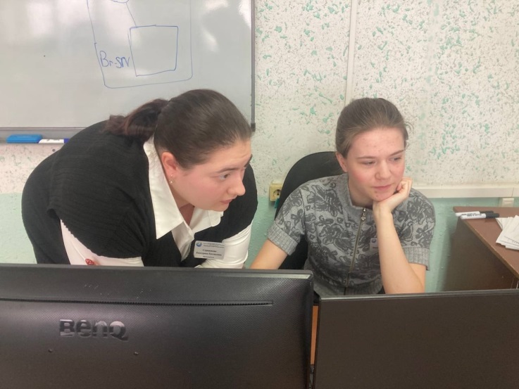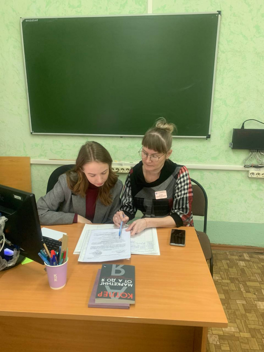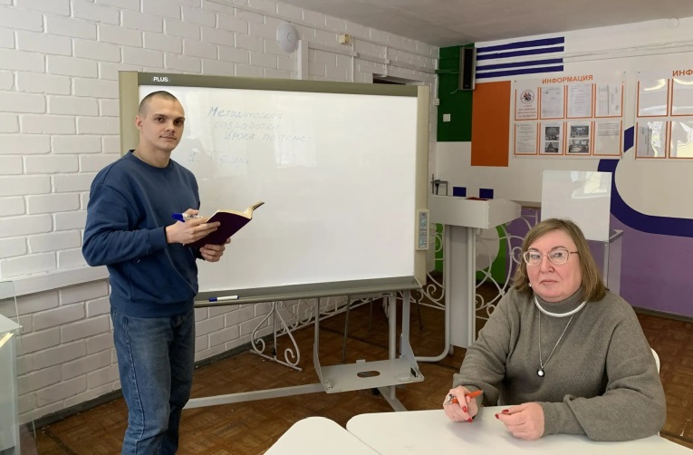 «Педагог-педагог» Наставник Кротова Т.В. с молодым педагогом Тарасовым К.Е. разбирают методологическую структуру урока |